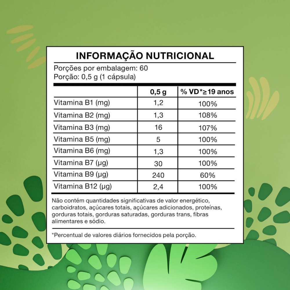 Contendo um amplo espectro de vitaminas do complexo B, incluindo B1 (tiamina), B2 (riboflavina), B3 (nicotinamida), B5 (D-pantotenato de cálcio), B6 (piridoxina), B7 (biotina), B9 (ácido fólico) e B12 (cianocobalamina), este suplemento é essencial para liberar a energia necessária ao funcionamento do corpo.