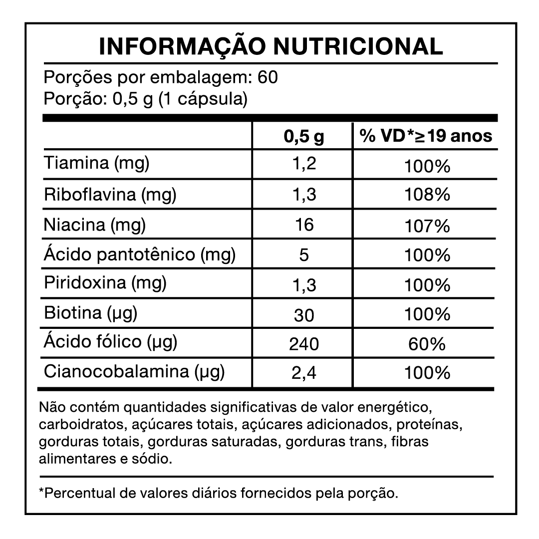 Nicotinamida (vitamina B3), D-pantotenato de cálcio vitamina B5]. riboflavina (vitamina B2), cloridrato de piridoxina (vitamina B6), cloridrato de tiamina vitamina B1, ácido fólico (vitamina B9), biotina (vitamina B7), cianocobalamina (vitamina B12), carbonato de cálcio, antiumectante dióxido de silício, lubrificante estearato de magnésio. Invólucro - cápsula dura: estabilizante celulose (hidroxipropilmetilcelulose).