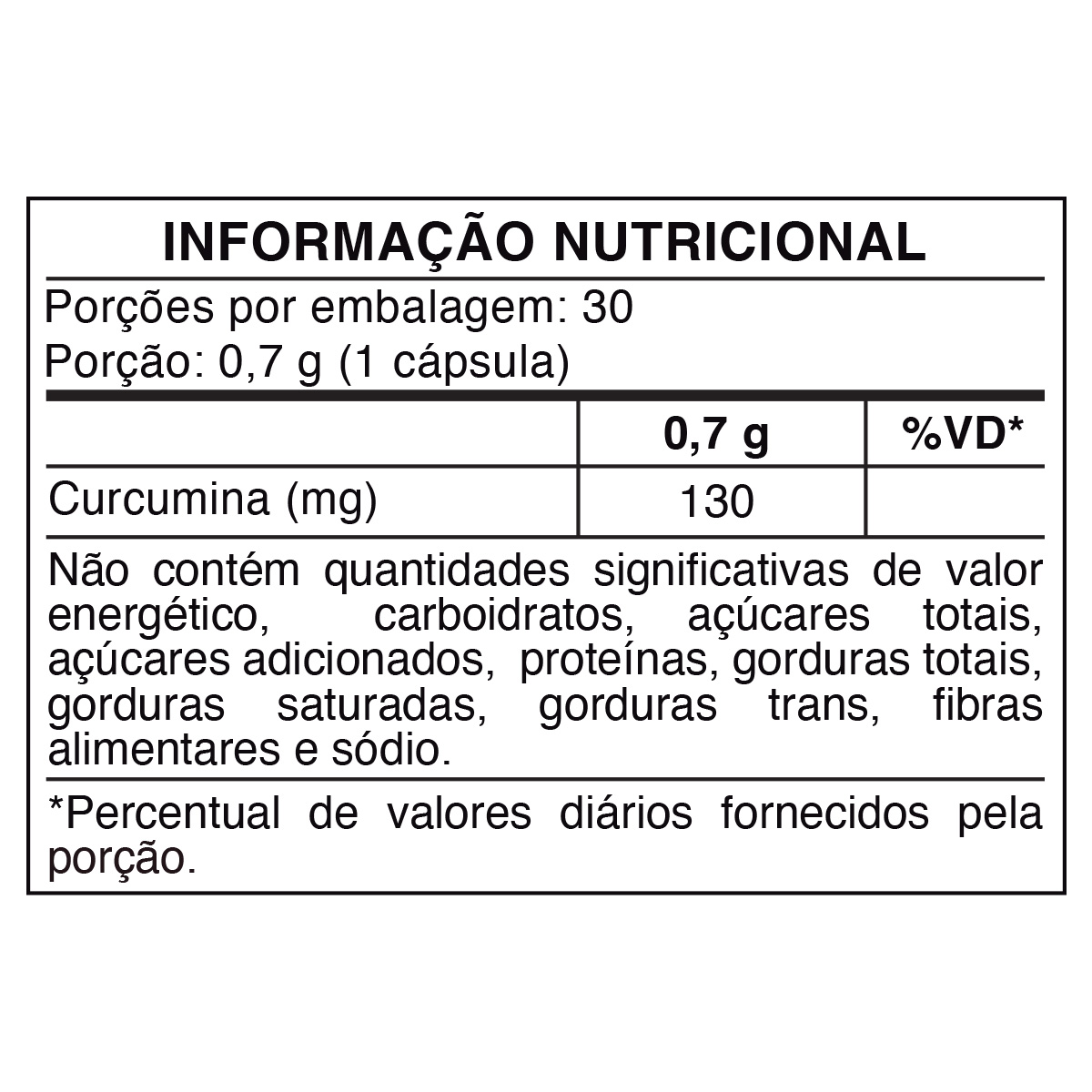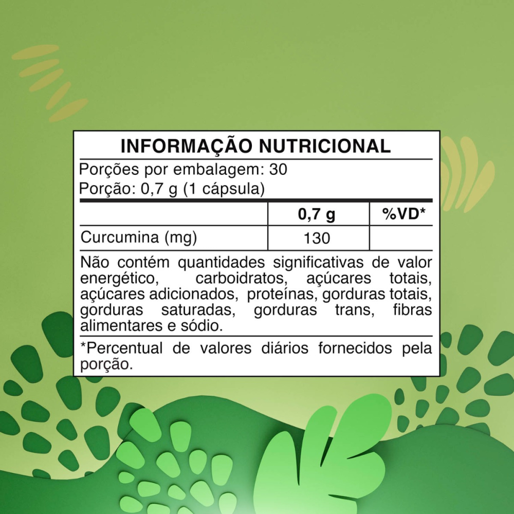 Cúrcuma (Curcuma longa), extrato de rizomas de Curcuma longa (Curcumina) e cápsula vegetal (glaceante hidroxipropilmetilcelulose, água purificada, carragena e acetato de potássio).