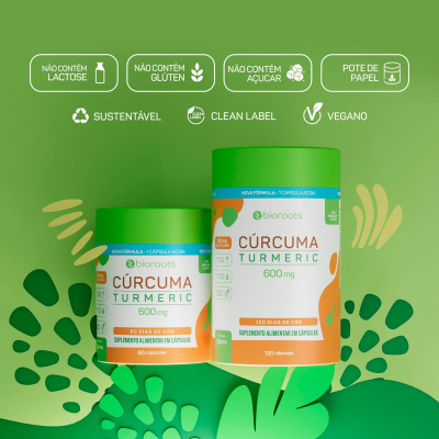 A Cúrcuma Turmeric 600mg da Bioroots é um suplemento nutricional 100% natural à base de extrato seco de cúrcuma, oferecendo 600mg de Extrato Seco + 130mg de Curcumina por cápsula.