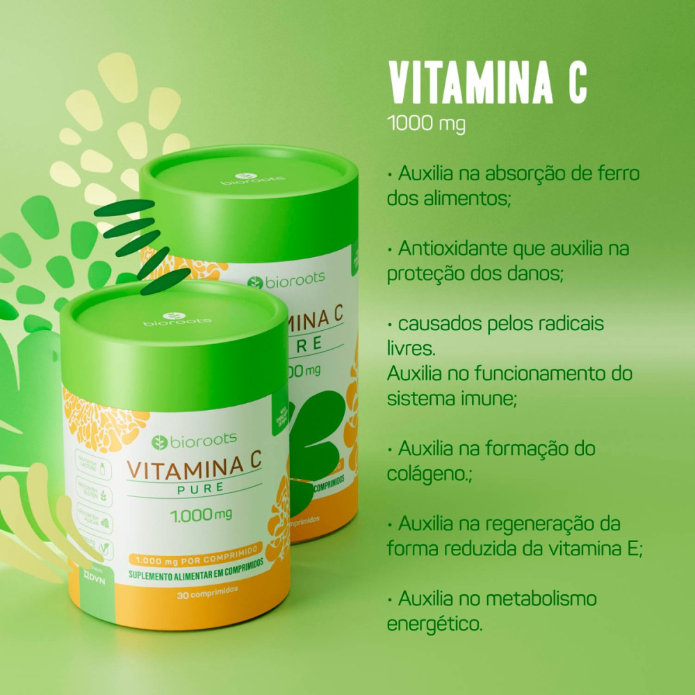 A Vitamina C da Bioroots é um suplemento alimentar em comprimidos que auxilia o sistema imunológico, além proteger contra os danos dos radicais livres e promover um metabolismo energético saudável.